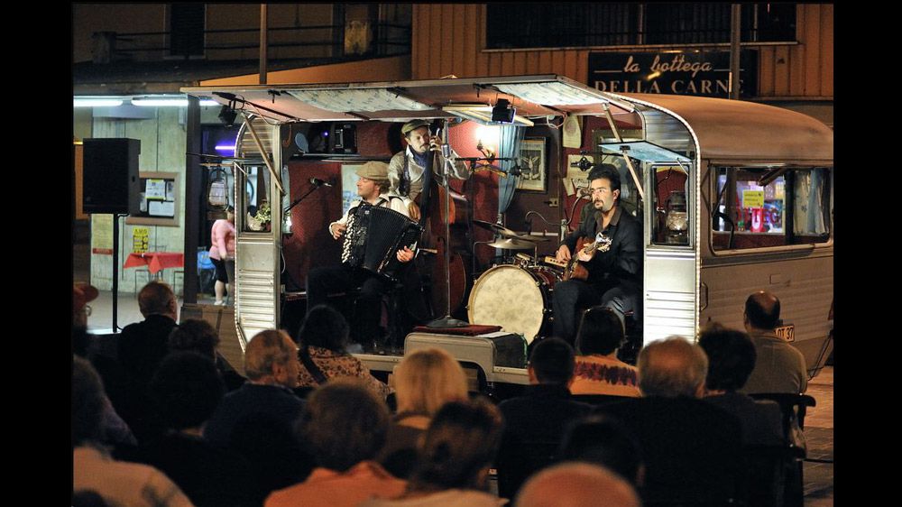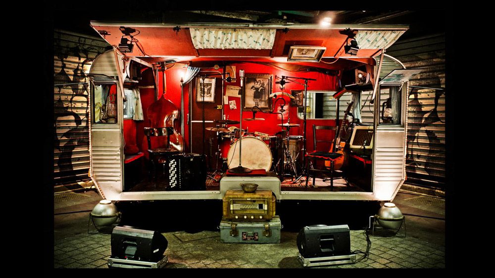Just like having a time machine between the 1930's and today. Over the past 12 years the Balluche de la Saugrenue has developped a unique style between singing, swing music, Musette* and contemporary styles. Behind the Balluche de la Saugrenue are five musicians with diverse musical backgrounds who have made it their mission to dust off music from Paris' cosmopolitan 1930s and to inject it with a generous dose of the present! They travel around festivals and towns aboard their caravan-production or on stage and roll out their show of songs to iconoclastic rhythms: reggae-waltz, paso-punk and swing-dancefloor, to create a dynamic and poetic musical show in the form of a ‘whimsical ball’ where emotion is combined with an irresistible desire to dance. 2016 was a turning point, with a new team, a new show, the use of more modern instruments, and more ample space given to the lyrics and the staging/ theatrics of the songs. Today, the group performs two distinct concerts: Balluche Soundsystem, a performance combining cotemporary acoustics and the 1930s styles, and Le P'tit Bal Perdu (Little Lost Ball), a full-fledged cabaret ball served the old-fashioned way. Internationally recognised and identified as world-music artists, the Balluche has performed in France and other parts of Europe (Germany, Italy) as well as Japan and Laos. They have just released (2019) their 5th album, ‘Tone of Musette’.